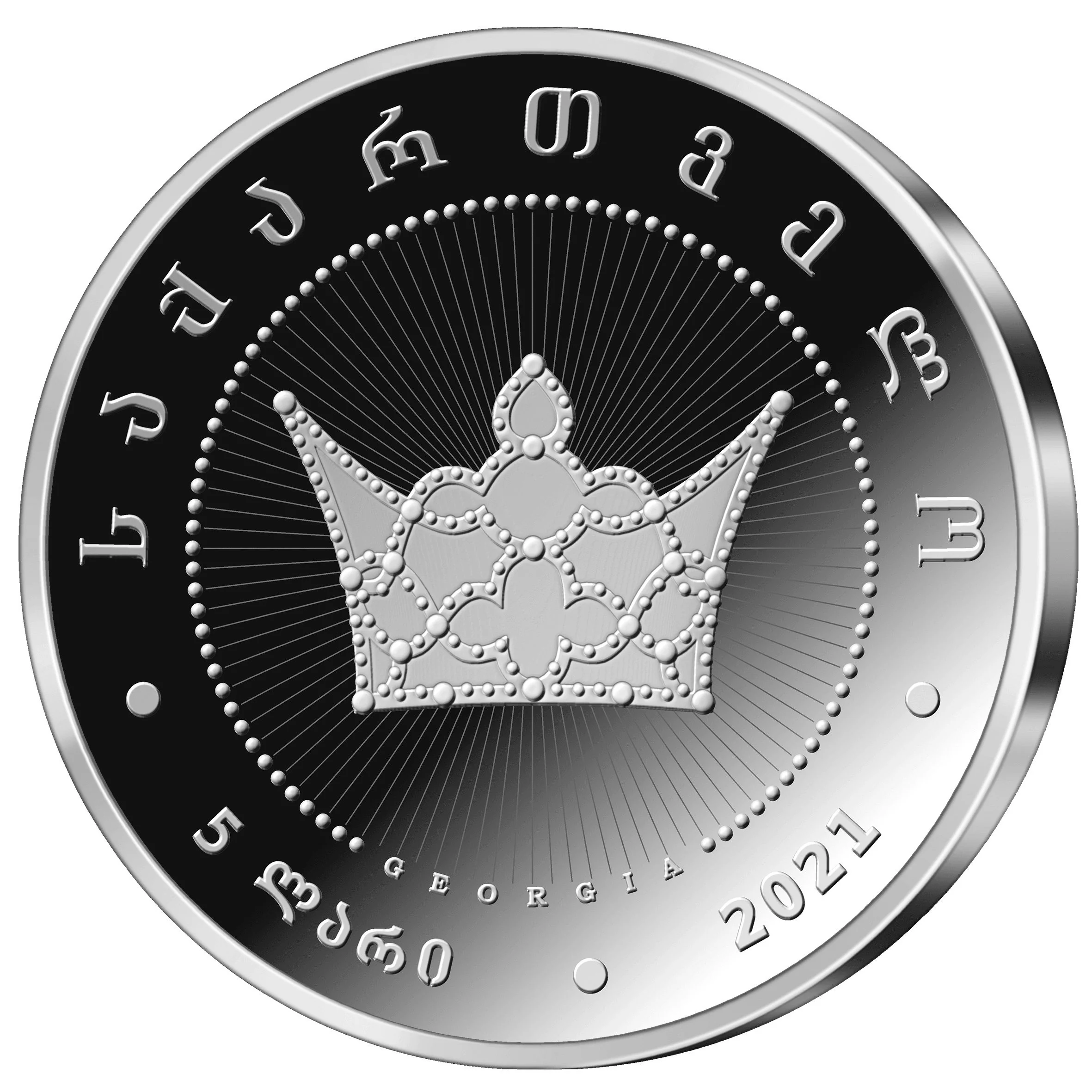 Central Queen's crown with Georgian and English inscriptions, value, and year.