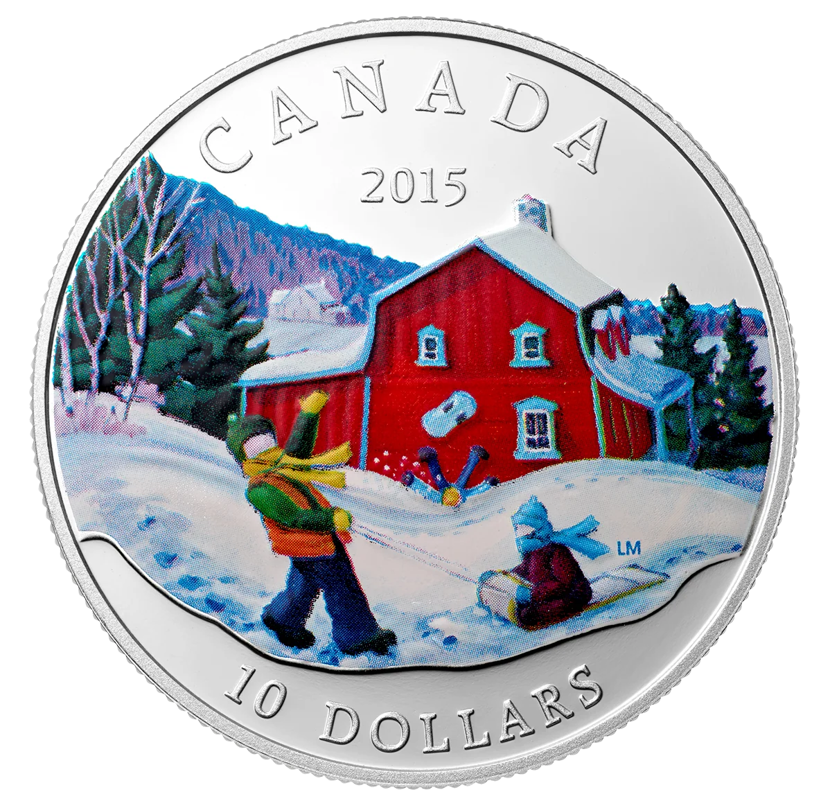 This coin depicts a bright winter scene of children tobogganing. One pulls a sled across a snowdrift, while another tumbles playfully nearby. Set against a red house, snowy hills, and a distant frozen lake, the image captures the fun and momentum of winter, with the comfort of home close by.