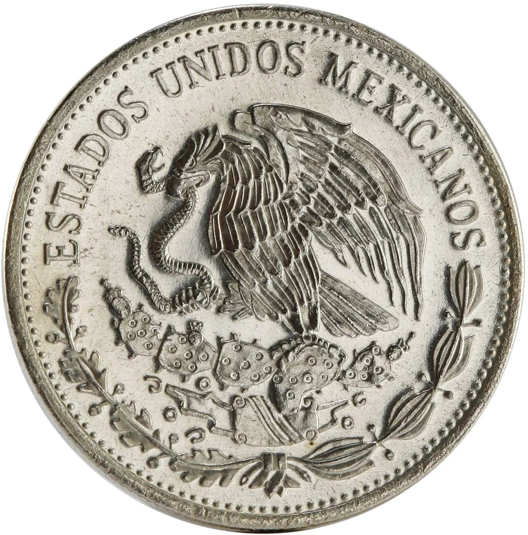 Lettering surrounds the central monument of Mexico City, with the value on the left and the date and mint mark below.