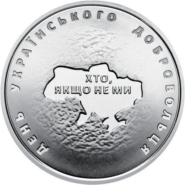 A map of Ukraine on a raised background bears the central motto "ХТО, ЯКЩО НЕ МИ" (If not us, who), encircled by the text "ДЕНЬ УКРАЇНСЬКОГО ДОБРОВОЛЬЦЯ" (Ukrainian Volunteer Day).