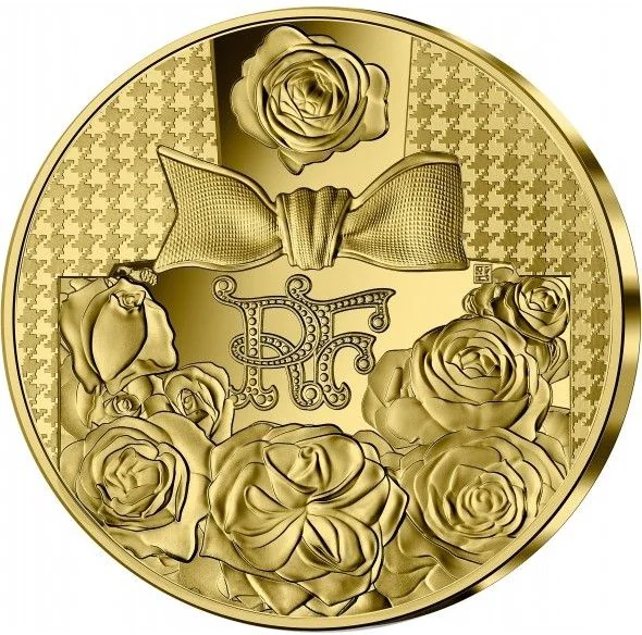 Flowers encircling "RF" (French Republic), topped by a bow.