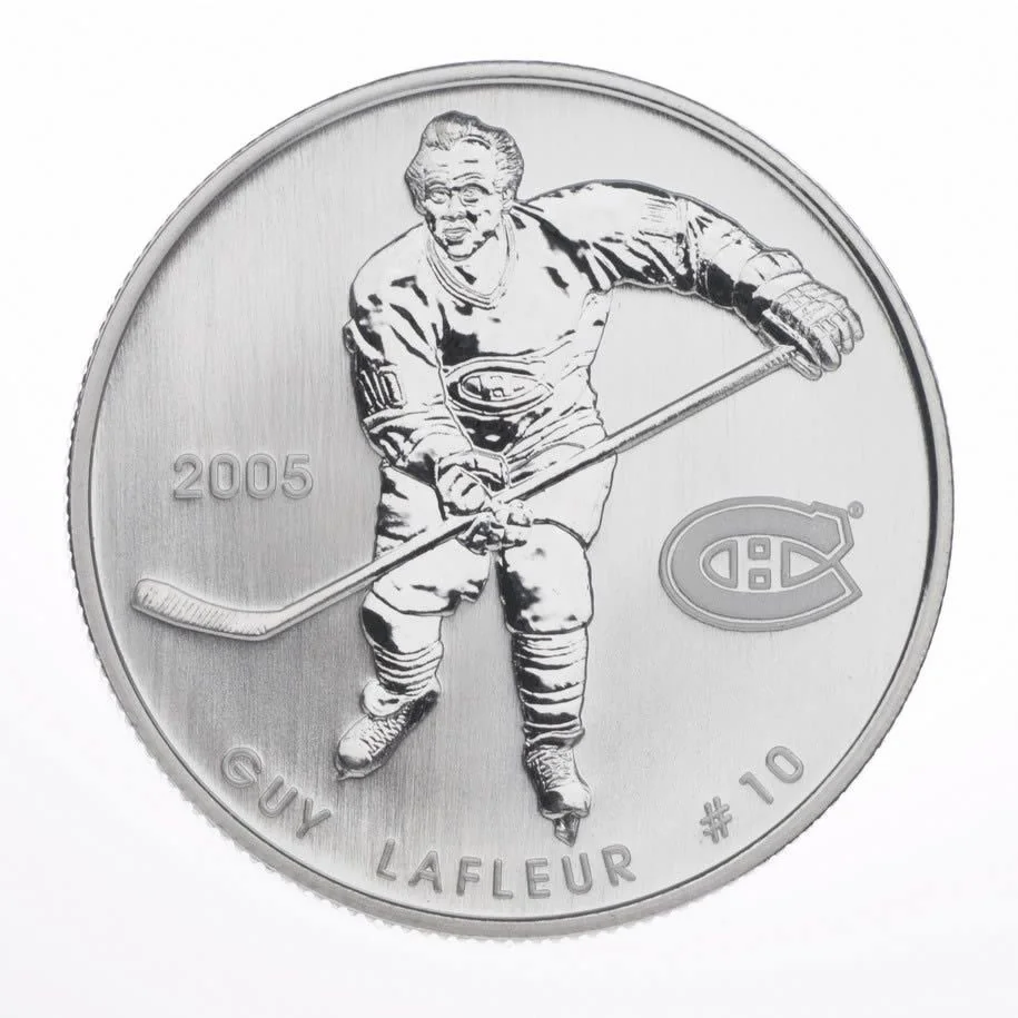 Guy Lafleur #10 playing hockey, with the Canadiens logo on the right and the date on the left.