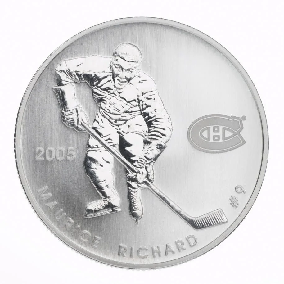 Maurice Richard #9 in action, with the Montreal Canadiens logo on the right and the date on the left.