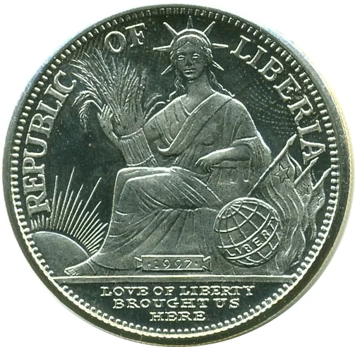 Seated Liberty with wheat, flags, globe, and radiant sun.