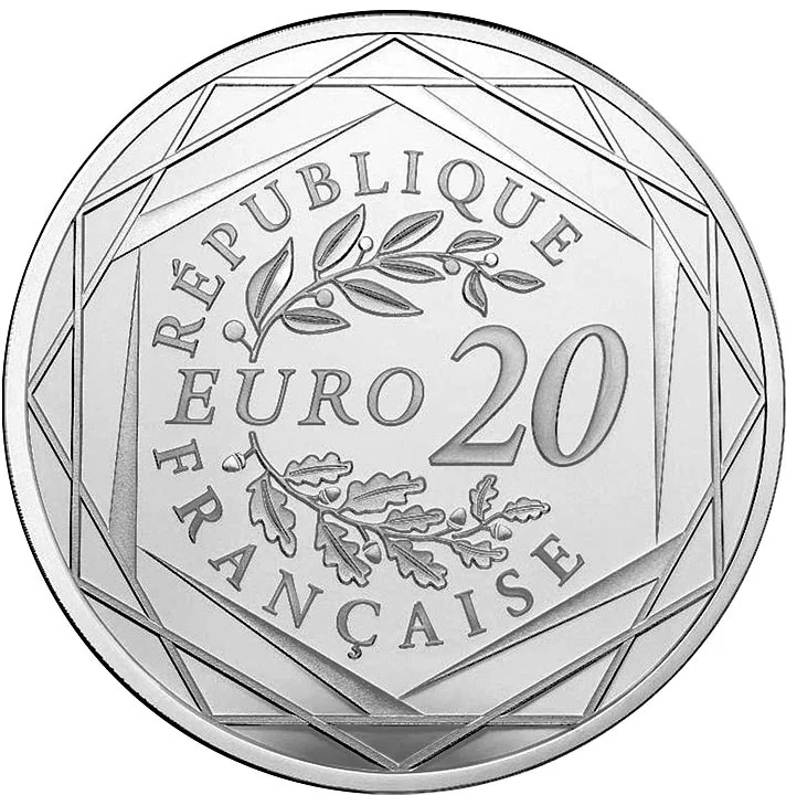 A laurel and oak branch flank the face value, encircled by the French motto and three hexagons.
