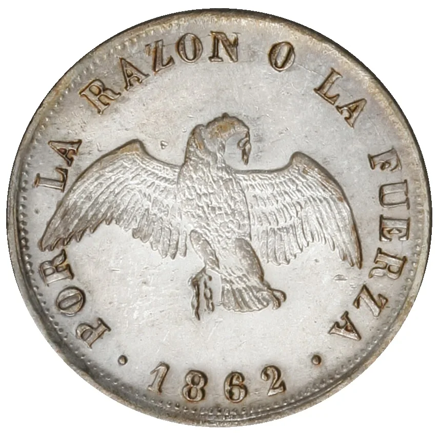 In 1860, Chile's currency situation was characterized by a complex and often chaotic system of multiple, concurrently circulating coins, both foreign and domestic. The official monetary system was theoretically bimetallic, based on the peso (divided into 8 reales), with its value defined by a fixed ratio between gold and silver. However, the discovery of rich silver deposits in the 1830s, particularly in Chañarcillo, led to a massive influx of silver coinage. This overabundance caused the market value of silver to fall below its official fixed rate relative to gold, leading to the practical disappearance of gold coins from circulation as they were hoarded or exported—a classic example of Gresham's Law, where "bad money drives out good."