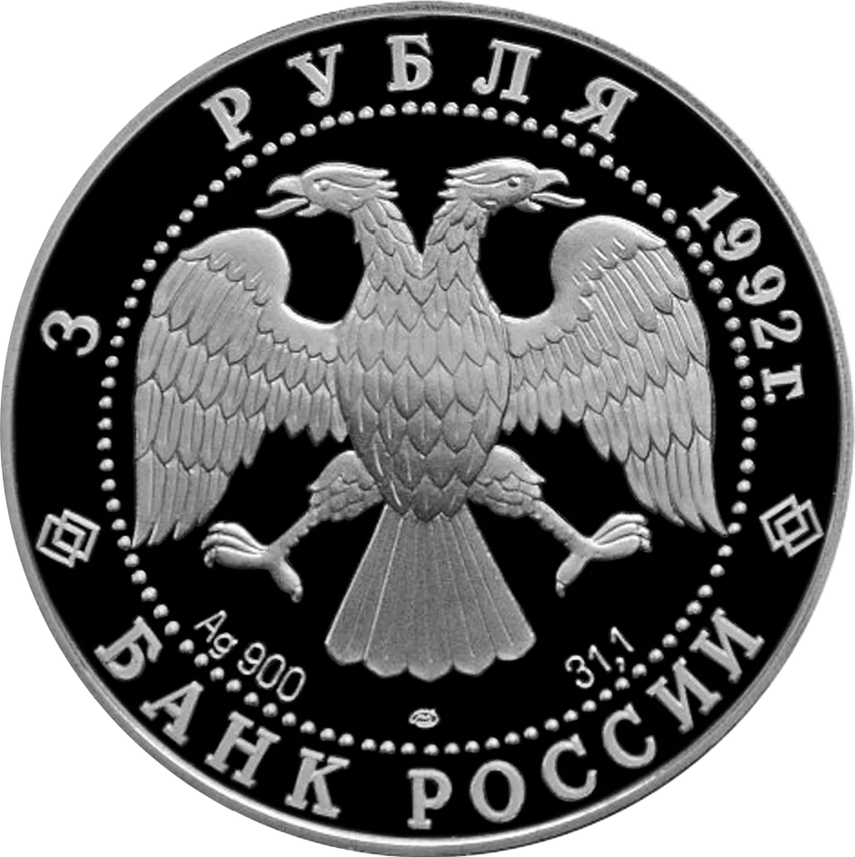 At center: the Bank of Russia emblem (two-headed eagle). Below it, left: metal and fineness; center: mint mark; right: fine weight. Around the rim, top: "3 РУБЛЯ 1992"; bottom: "БАНК РОССИИ", separated by doubled rhombuses.