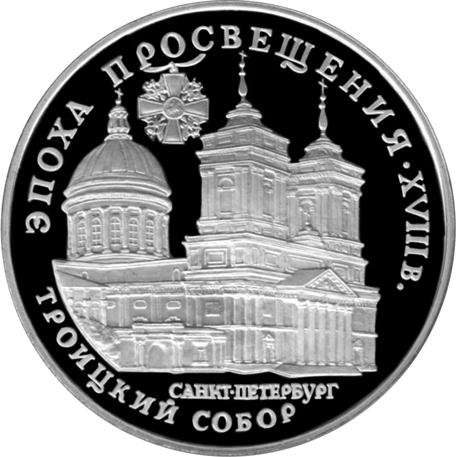 Center: The Saint Trinity Cathedral of the Alexandro-Nevskaya Lavra, topped by the Order of Alexander Nevsky sign, with "САНКТ-ПЕТЕРБУРГ" below. Rim: Above, "ЭПОХА ПРОСВЕЩЕНИЯ. ХVIII ВЕК"; below, "ТРОИЦКИЙ СОБОР".