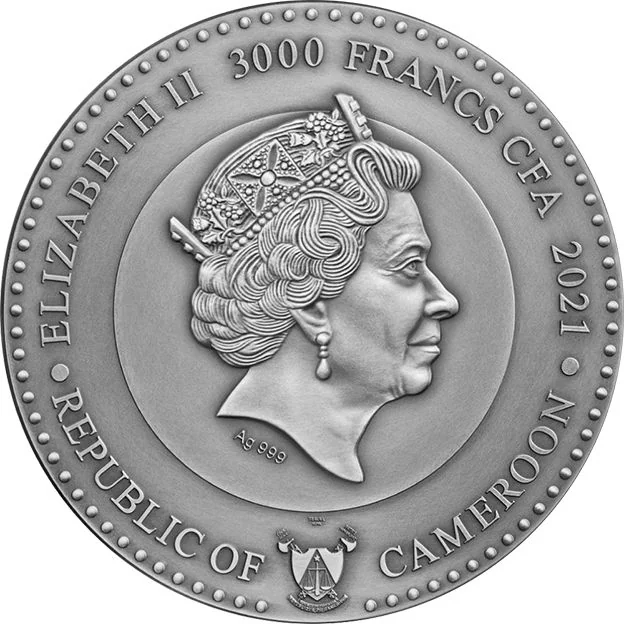 Description: Queen Elizabeth II facing right, wearing the Diamond Diadem and Coronation Earrings. Cameroon's coat of arms below.