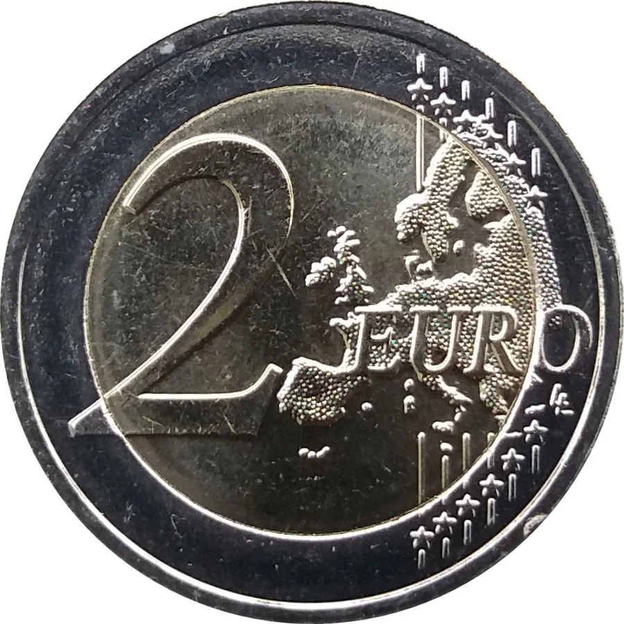 A Western Europe map spans the coin's right side, with "2 EURO" overlaid—the "2" in the Atlantic. Twelve stars flank the map, six above and six below, connected by six vertical stripes across the inner core.