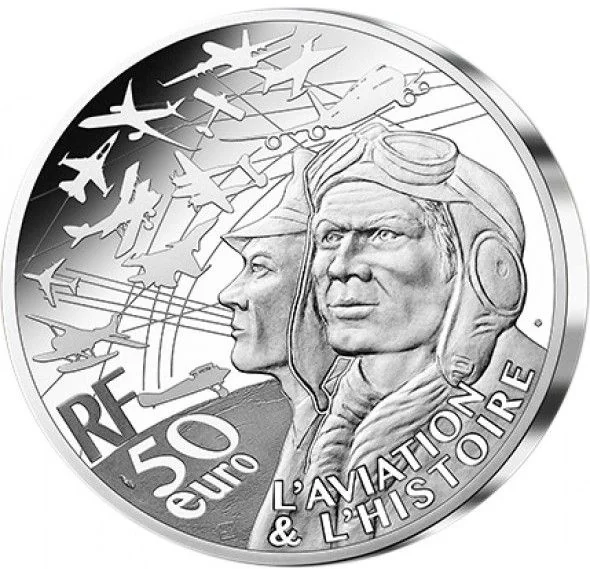 Two pilots embody civil and military aviation across eras, with diverse aircraft filling the sky in tribute to flight history. The reverse features the face value and "RF" symbol.