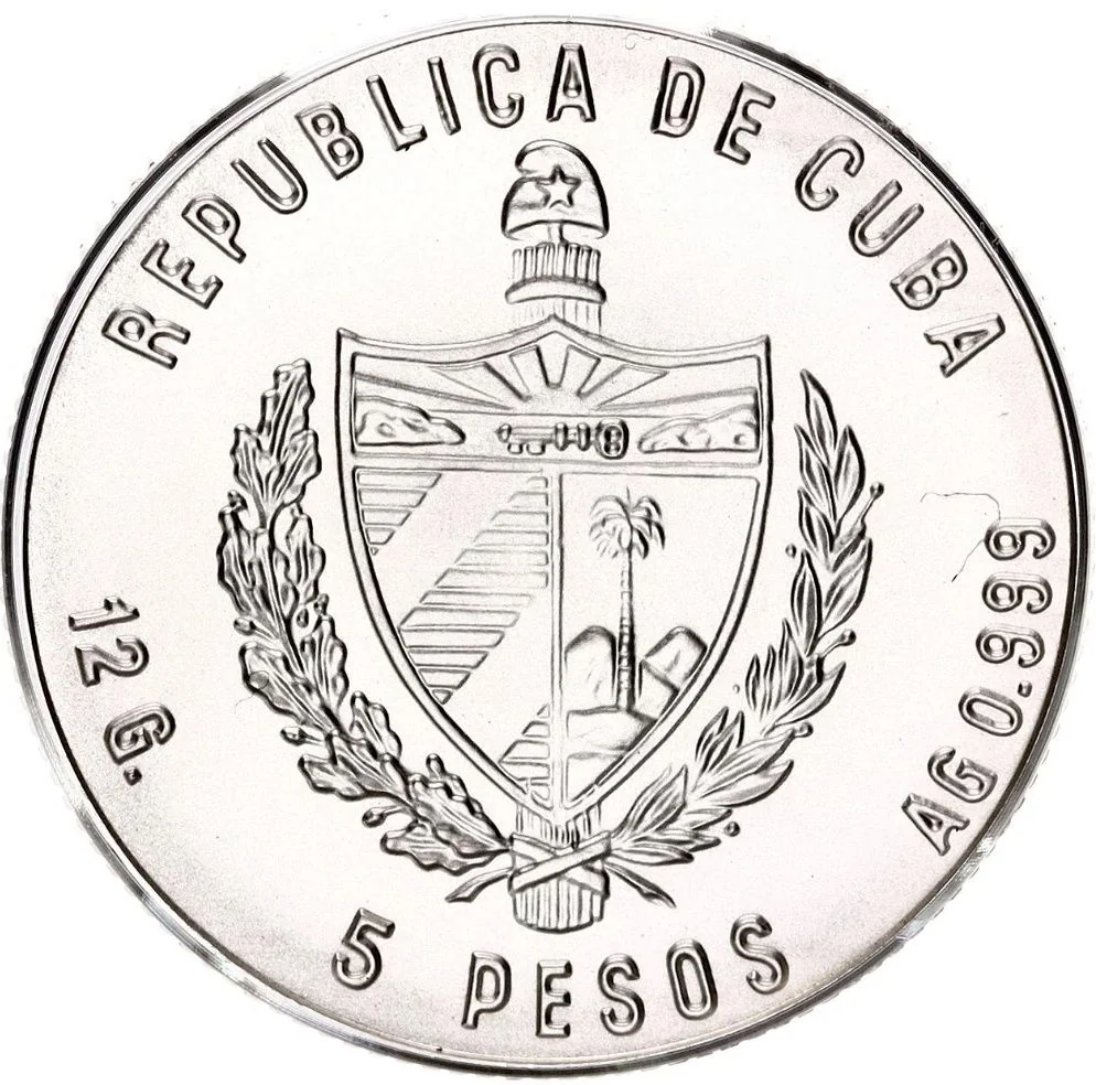 Cuban coat of arms with country name above, weight and fineness on the sides, and face value below.