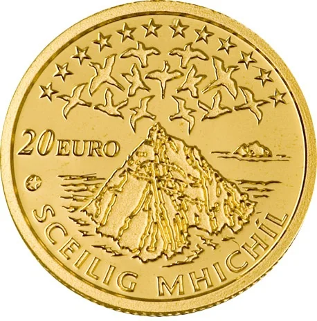 The Skellig Islands: Little Skellig (uninhabited, right) and Skellig Michael (larger). Above are thirteen birds and the twelve stars of the European Union.