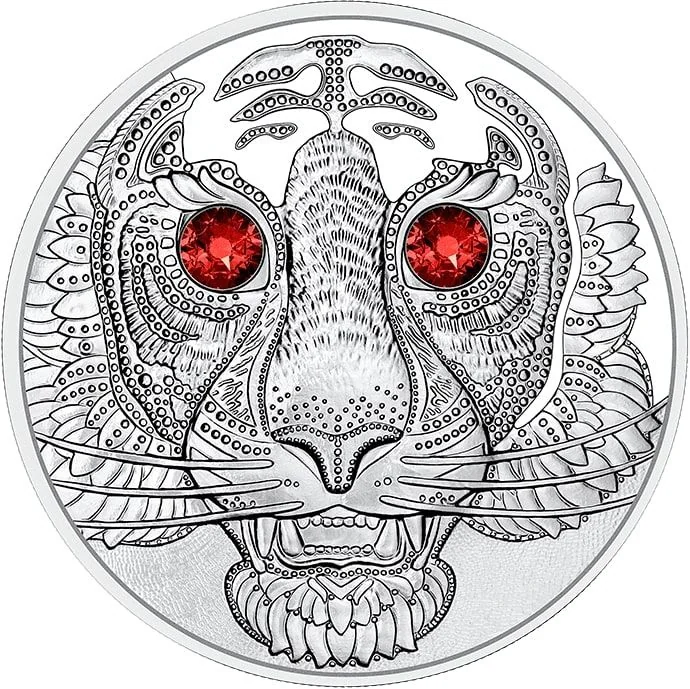 A tiger's head adorned with dotted scars and Swarovski crystals.