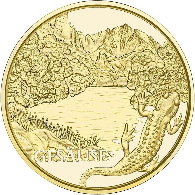 Gateway to the Gesäuse: a vast forest panorama with the Enns River below the 2,335-meter Großer Ödstein. An alpine salamander crawls in the foreground.