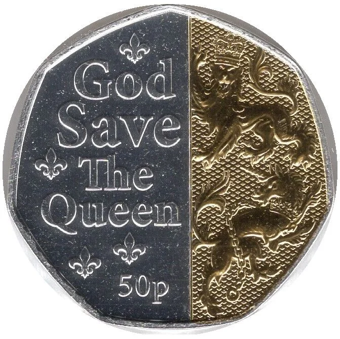 "God Save the Queen" with the Lion of England and Unicorn of Scotland.