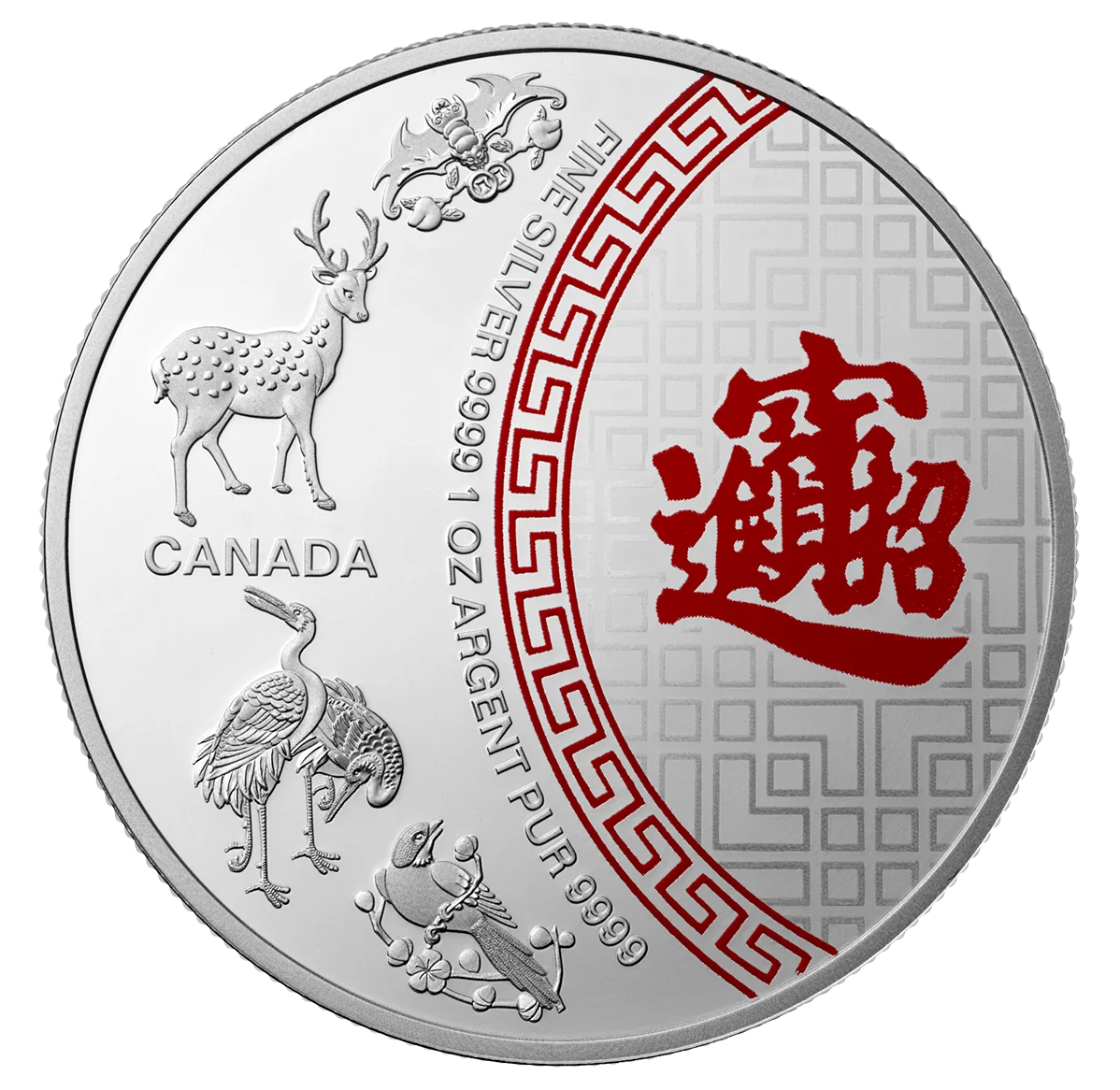 A bat (happiness), deer (success), crane (long life), and two magpies (joy) adorn one side, while the reverse features ornate circles overlaid with a Chinese symbol for wishing good fortune.