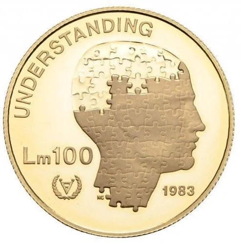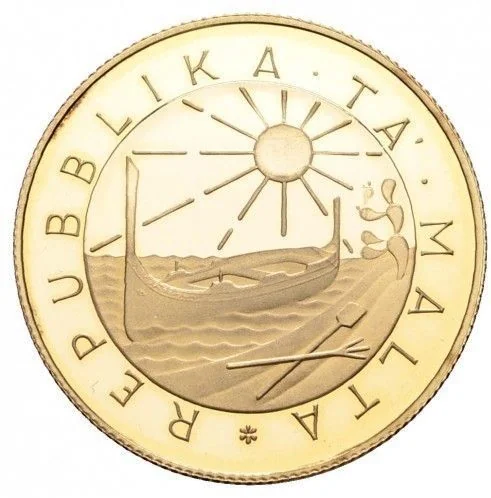Coat of arms featuring a sunrise over a coastal scene with a Maltese luzzu boat, a shovel, a pitchfork, and an Opuntia plant, encircled by the Republic of Malta's name.