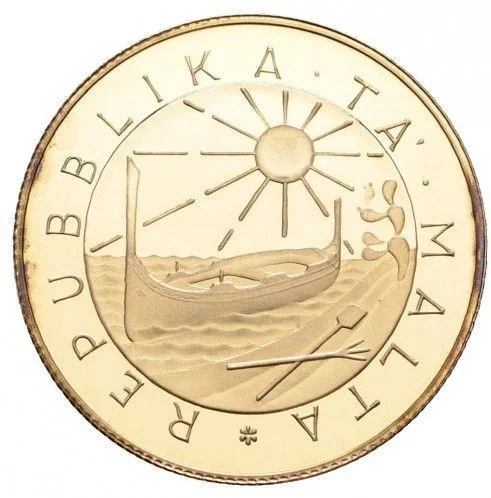 Coat of arms featuring a sunrise over a coastal scene with a Maltese luzzu boat, a shovel, a pitchfork, and an Opuntia plant, encircled by the Republic of Malta's name.