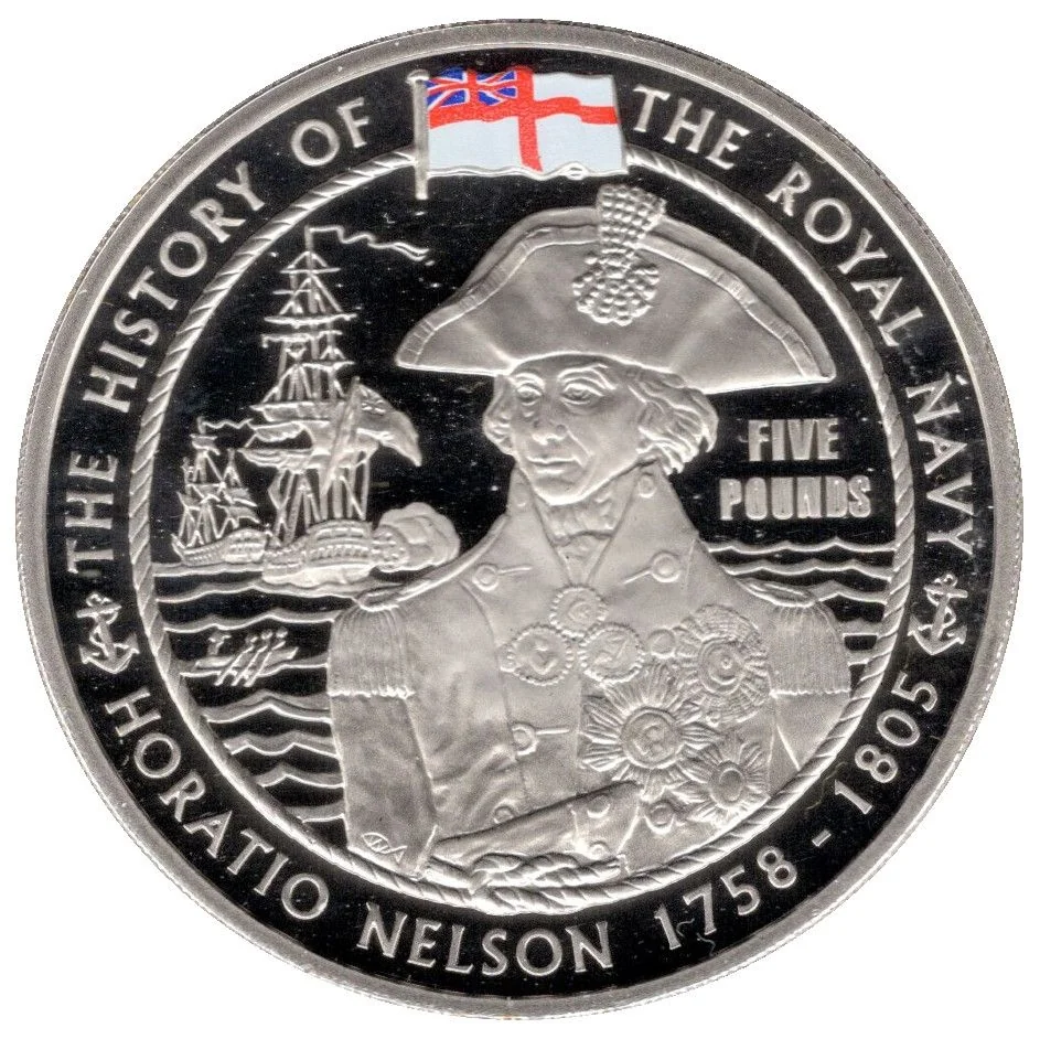 Colourised portrait of Vice Admiral Horatio Nelson with ships and naval flag.