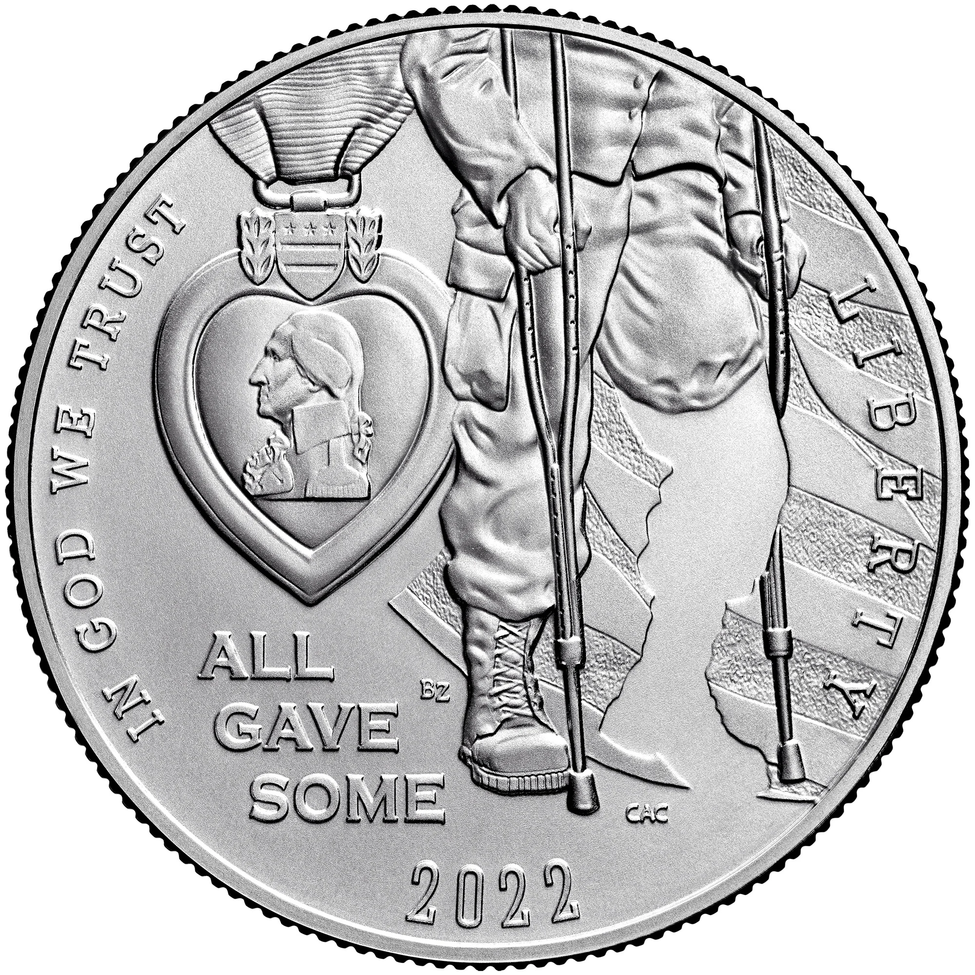 A soldier on crutches, missing a left leg. Its silhouette appears in the negative space, with a Purple Heart behind him.