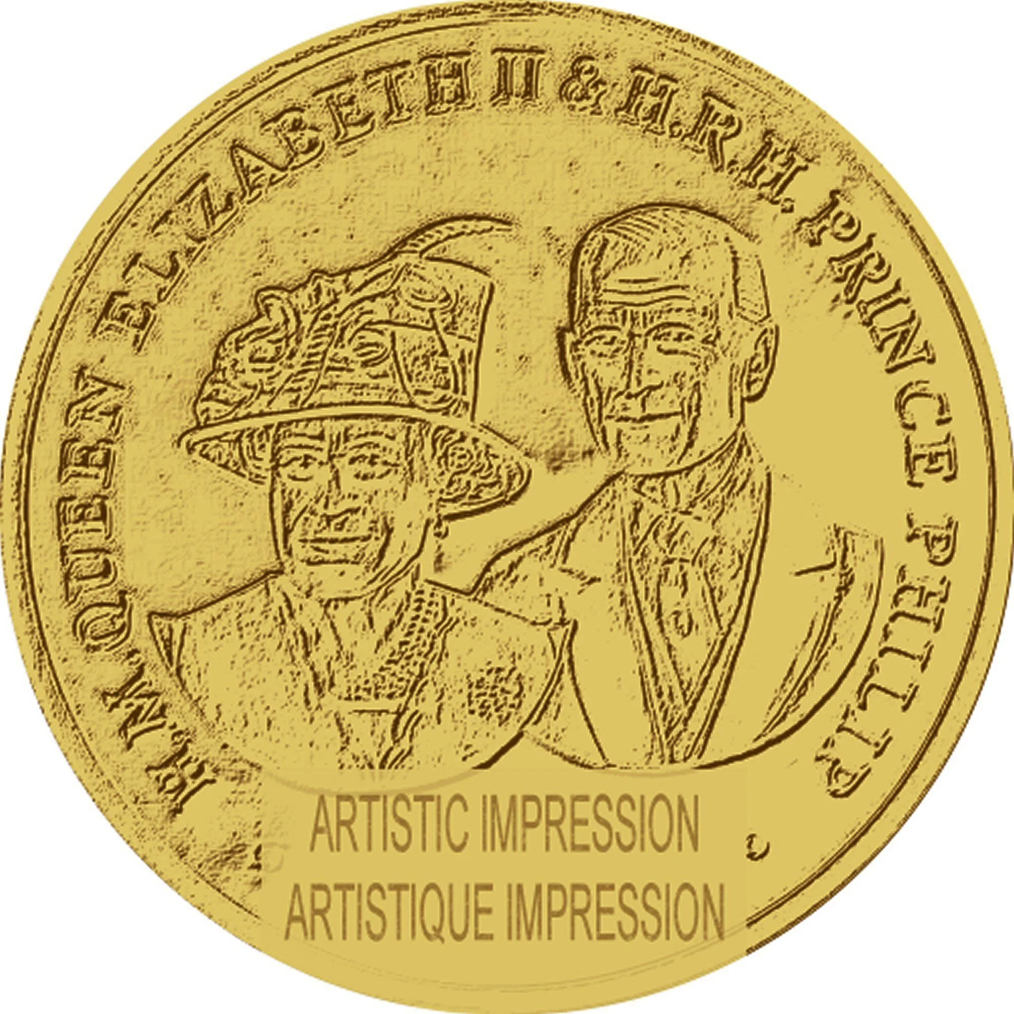 Profile of Queen Elizabeth II and Prince Philip, PM mintmark near her back.