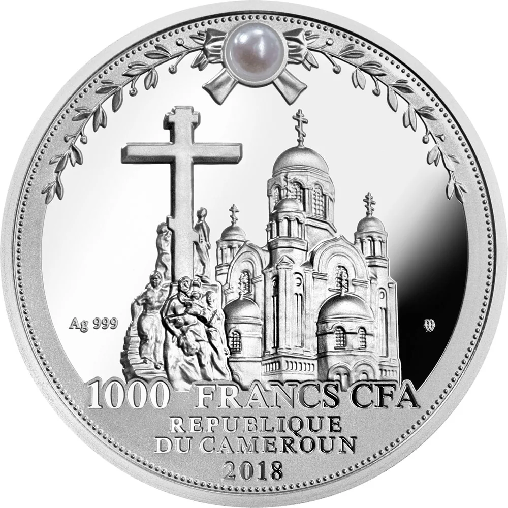 Exterior of the Church of All Saints and Romanov monument in Yekaterinburg, topped with laurel branches and a pearl.
