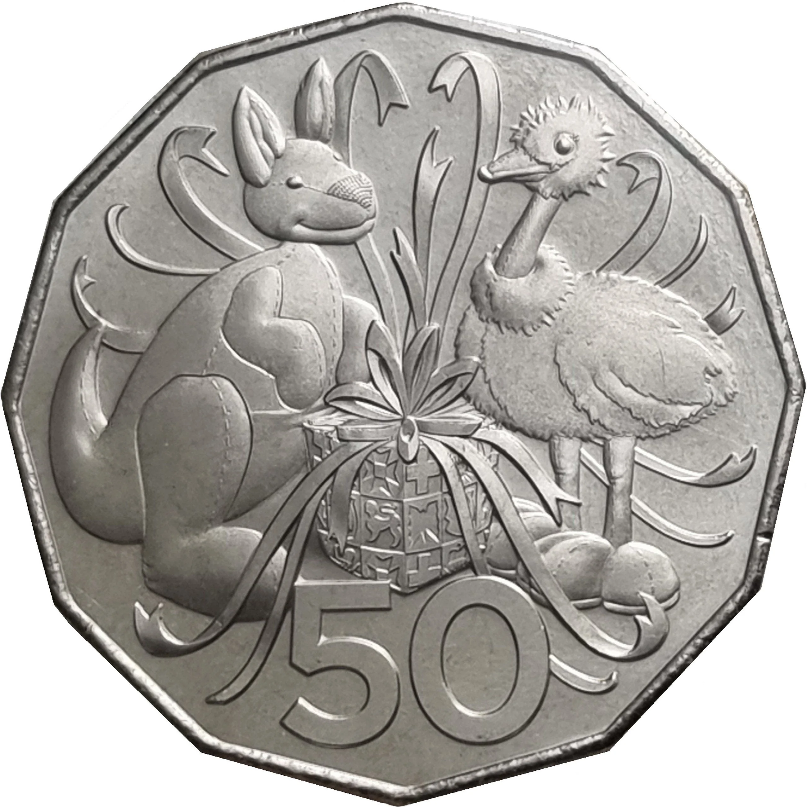 Plush kangaroo and emu flanking a gift box, styled after the Australian Coat of Arms.