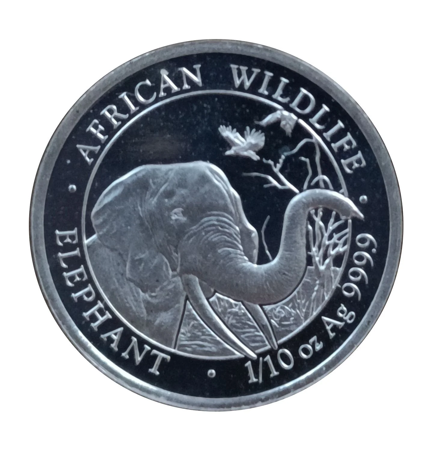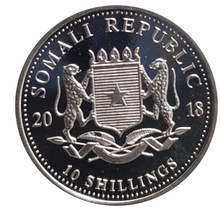 Features the Somalian Coat of Arms, date, and 10-shilling face value.