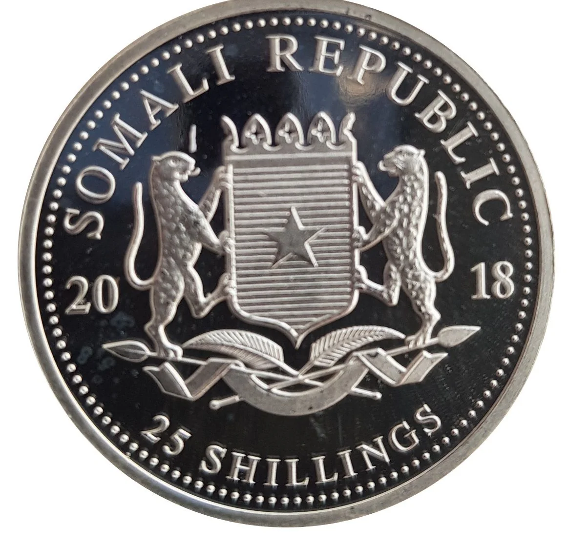 Features the Somalian Coat of Arms, the date, and a 25-shilling face value.