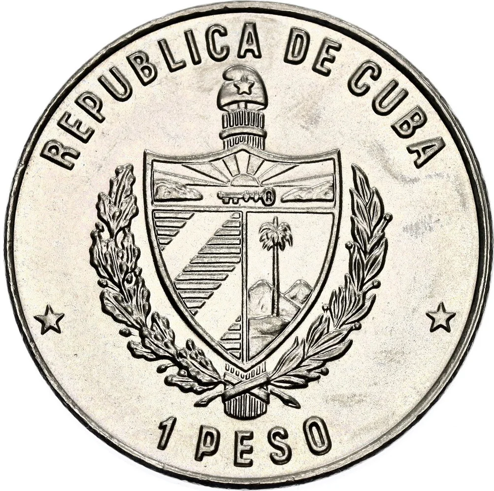 Cuban coat of arms, curved country name above, face value below, flanked by two 5-pointed stars.
