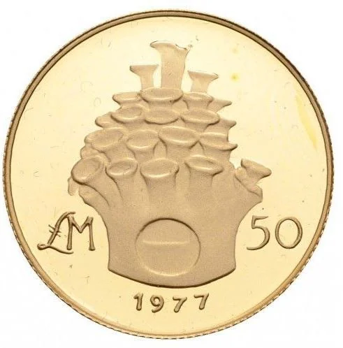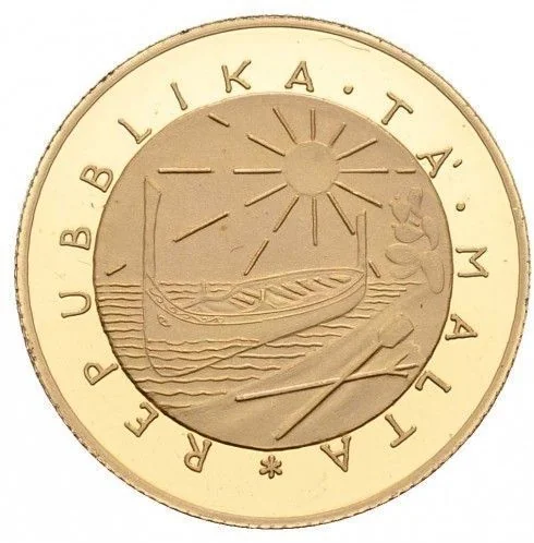 Coat of arms featuring a sunrise over a coastal scene with a Maltese luzzu boat, a shovel, a pitchfork, and an Opuntia plant, encircled by the Republic of Malta's name.