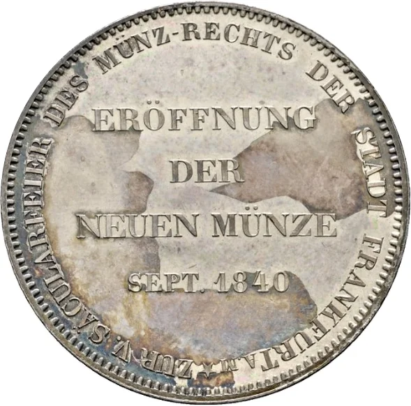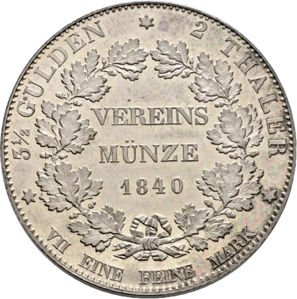 Description: Central inscription in three lines, date in oak wreath, surrounded by legend with denomination.