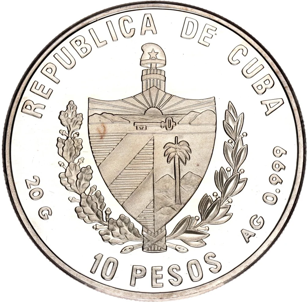 Cuban coat of arms with country name above, face value below, and weight/fineness on the sides.