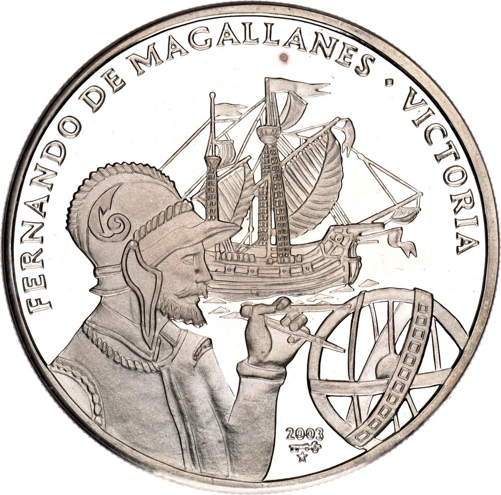 Image of Ferdinand Magellan with a ship and astrolabe. Name and ship name above and on sides. Issuing year and mintmark below.