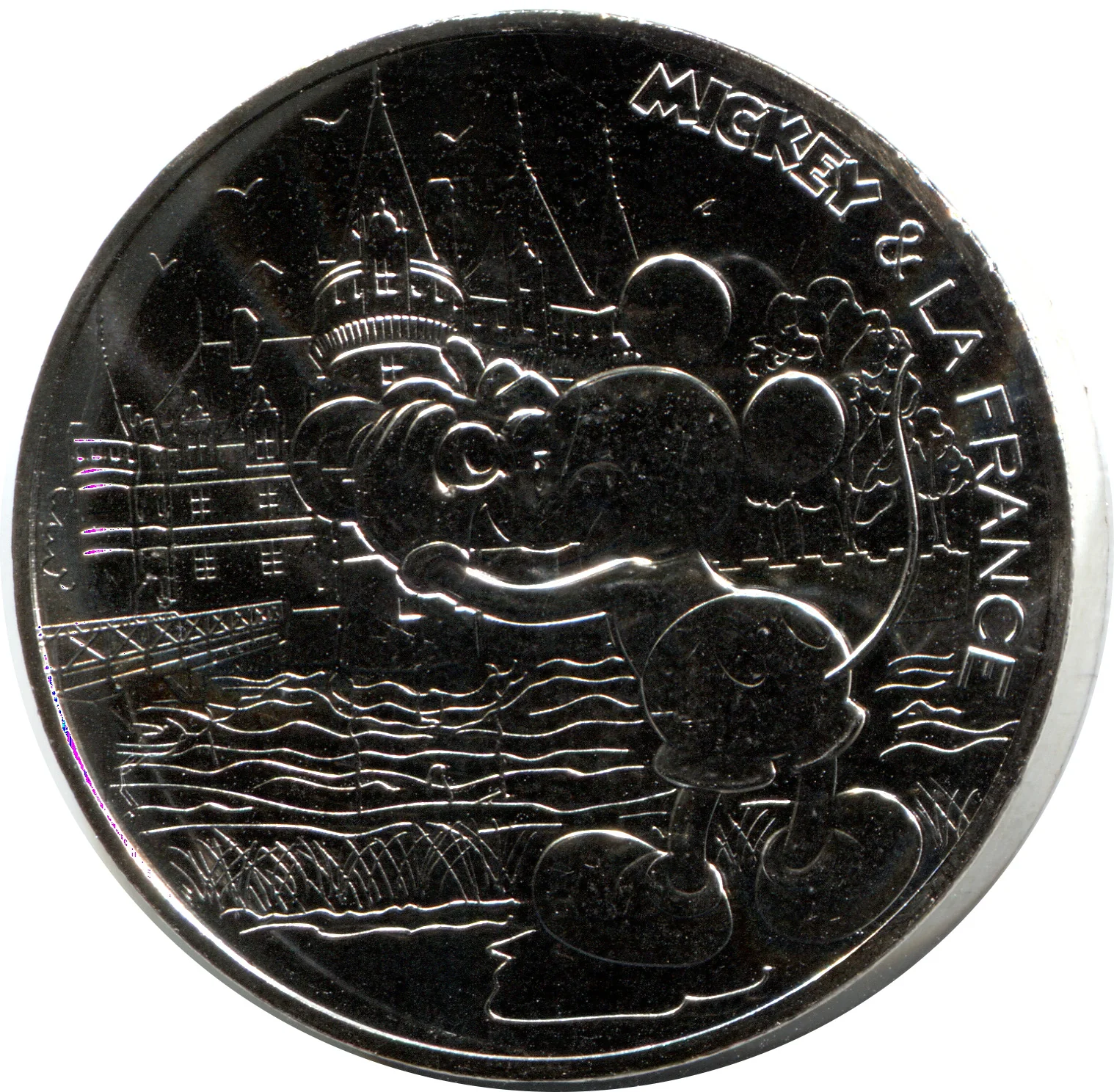 On the coin's reverse, Mickey uses binoculars to view the Loire castles, focusing on Azay le Rideau.