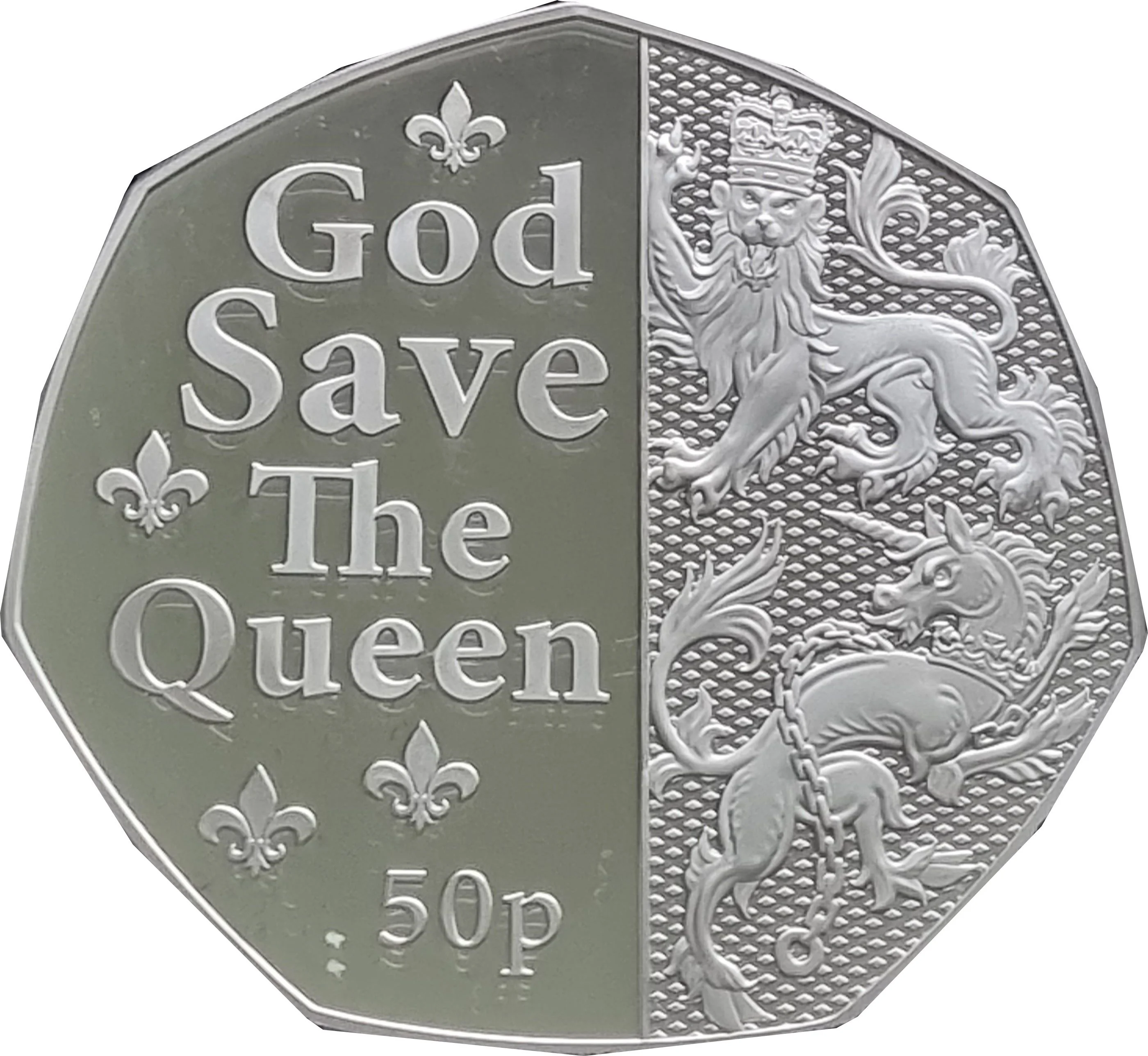 "God Save the Queen" with the Lion of England and Unicorn of Scotland.