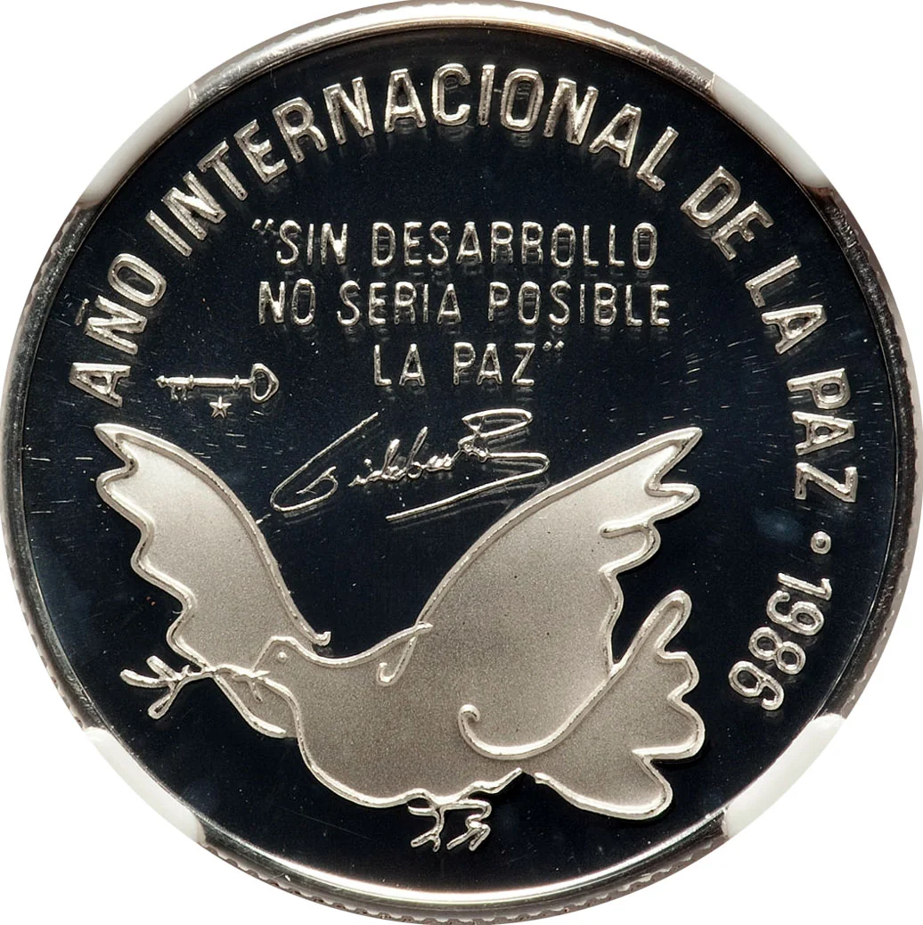Description: Fidel Castro's signature and phrase. Picasso's dove below, event name arched above, mintmark left, date right.