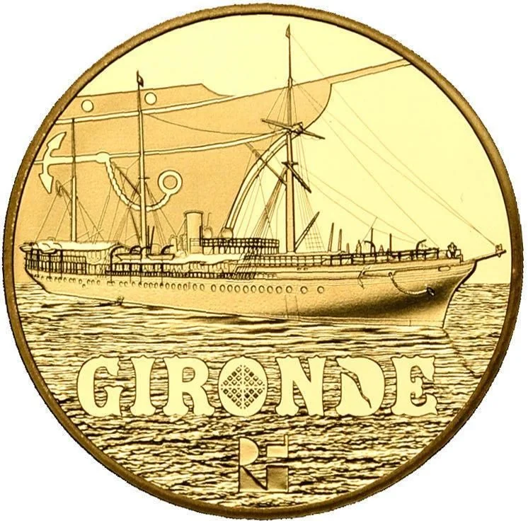 Composition common to all five annual coins: a porthole section topped by the liner's smokestacks and smoke, with the face value above. The 2015 vintage appears within the porthole, framed by various characters.