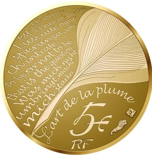 Feather, face value, and emblematic quotations from Voltaire, Dante, Shakespeare, and Nietzsche.
