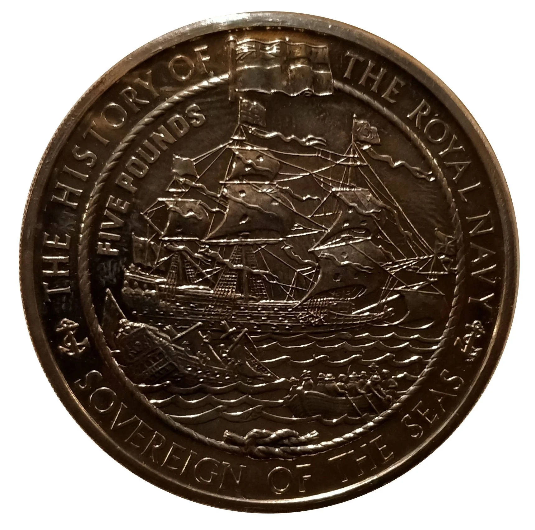 Sailing ship, sinking vessel, and rowboat under a flag.