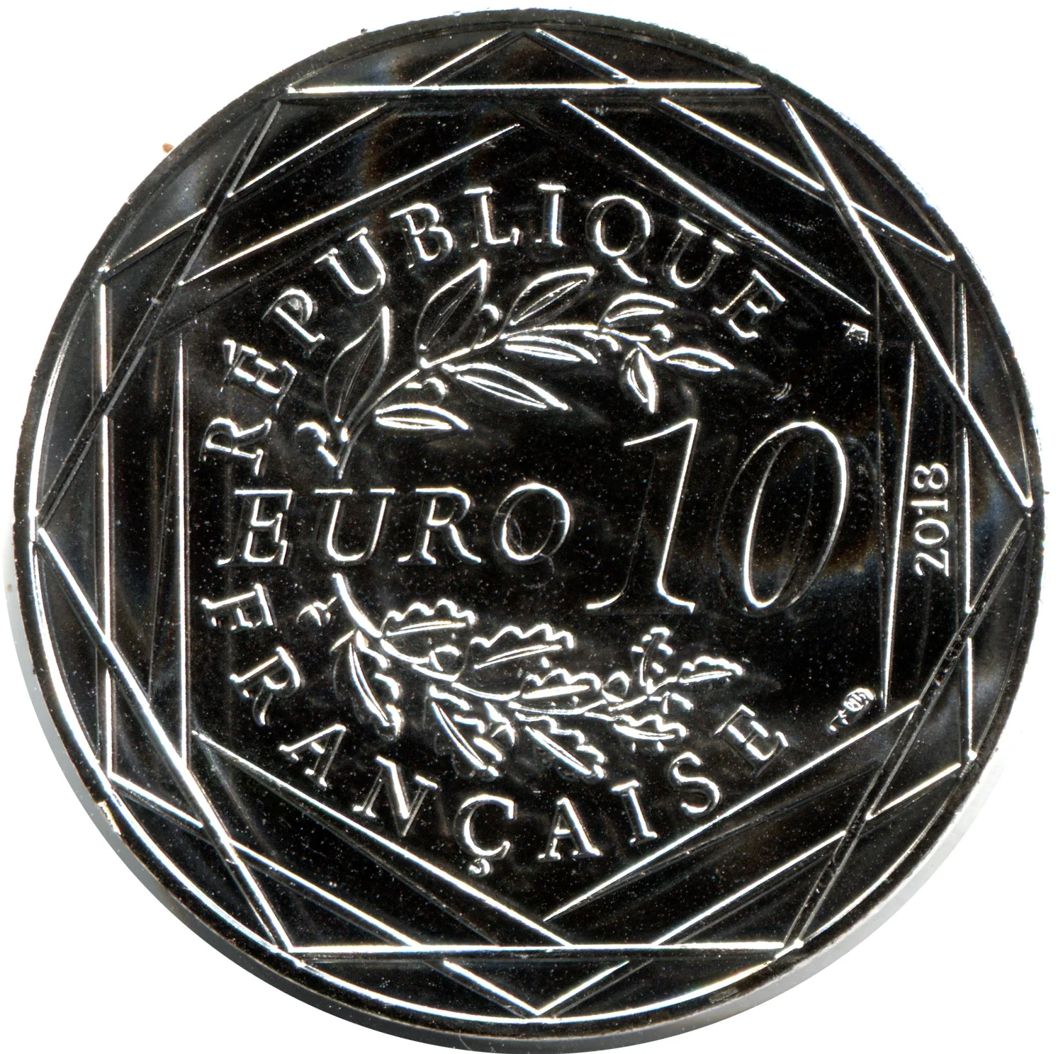 The obverse features the face value with oak and laurel branches, suggesting the Euro sign. The reverse motifs are framed by lines forming France's hexagon.