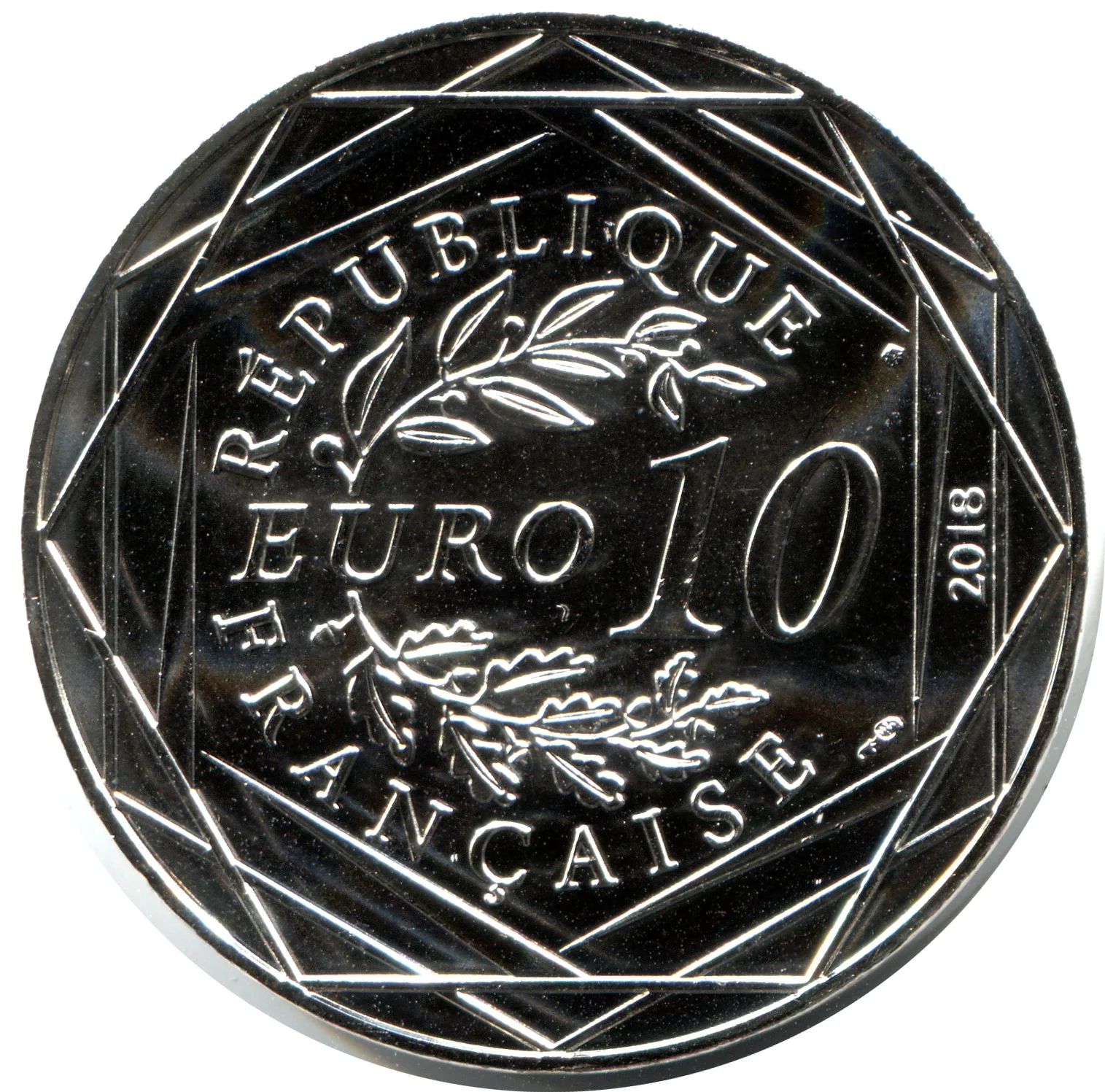 A laurel and oak branch echo the Euro sign, while lines frame the right side in France's hexagonal shape.