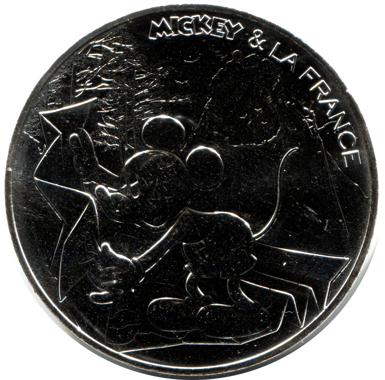 On the coin's reverse, Mickey studies his map of Corsica's GR20 trail with the Padule arch behind him.