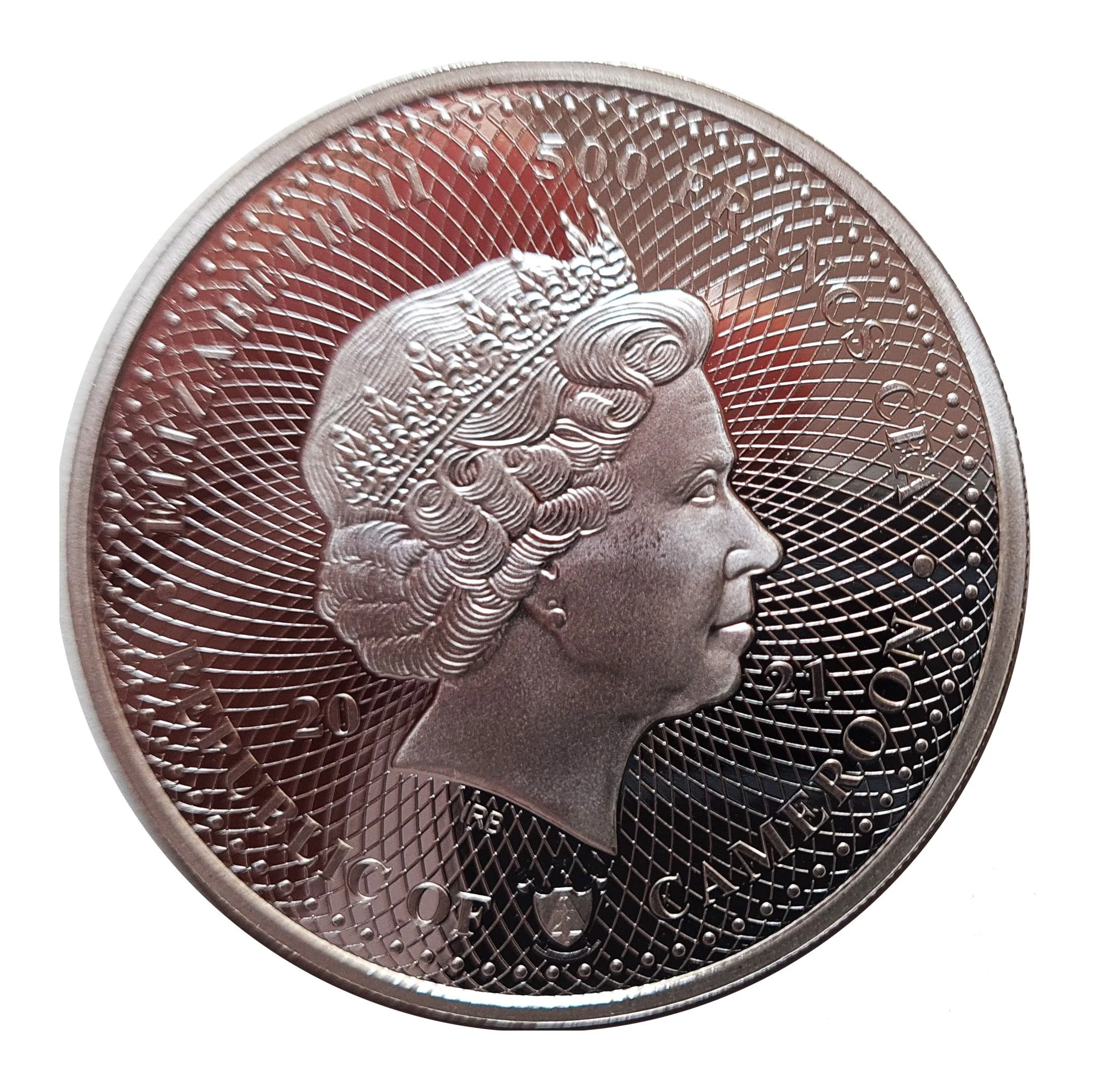 Queen Elizabeth II in profile, wearing the Girls of Great Britain and Ireland Tiara. Cameroon's coat of arms below.