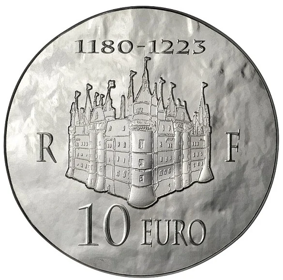 Central view of the Louvre under Philippe Auguste. Flanked by "R F", dates (1180-1223) above, value "10 EURO" below.