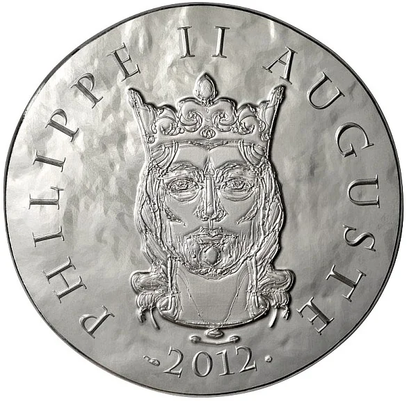 Portrait of King Philip II (Philip Augustus) wearing an early fleur-de-lis crown. The coin's circumference bears his name, with mint marks and the year below.