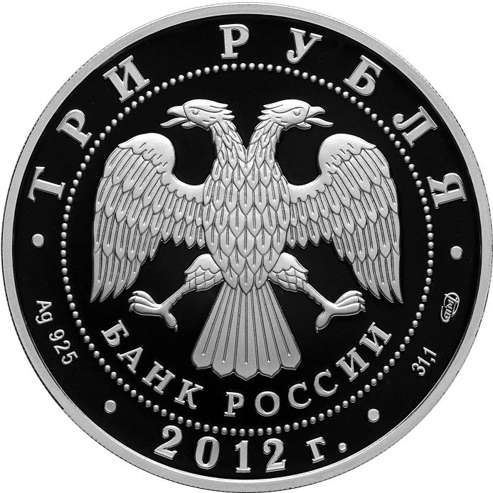 Features the Bank of Russia's two-headed eagle emblem above "БАНК РОССИИ," within a beaded circle. The rim inscription "ТРИ РУБЛЯ" and "2012" frames metal specifications and the mint mark.