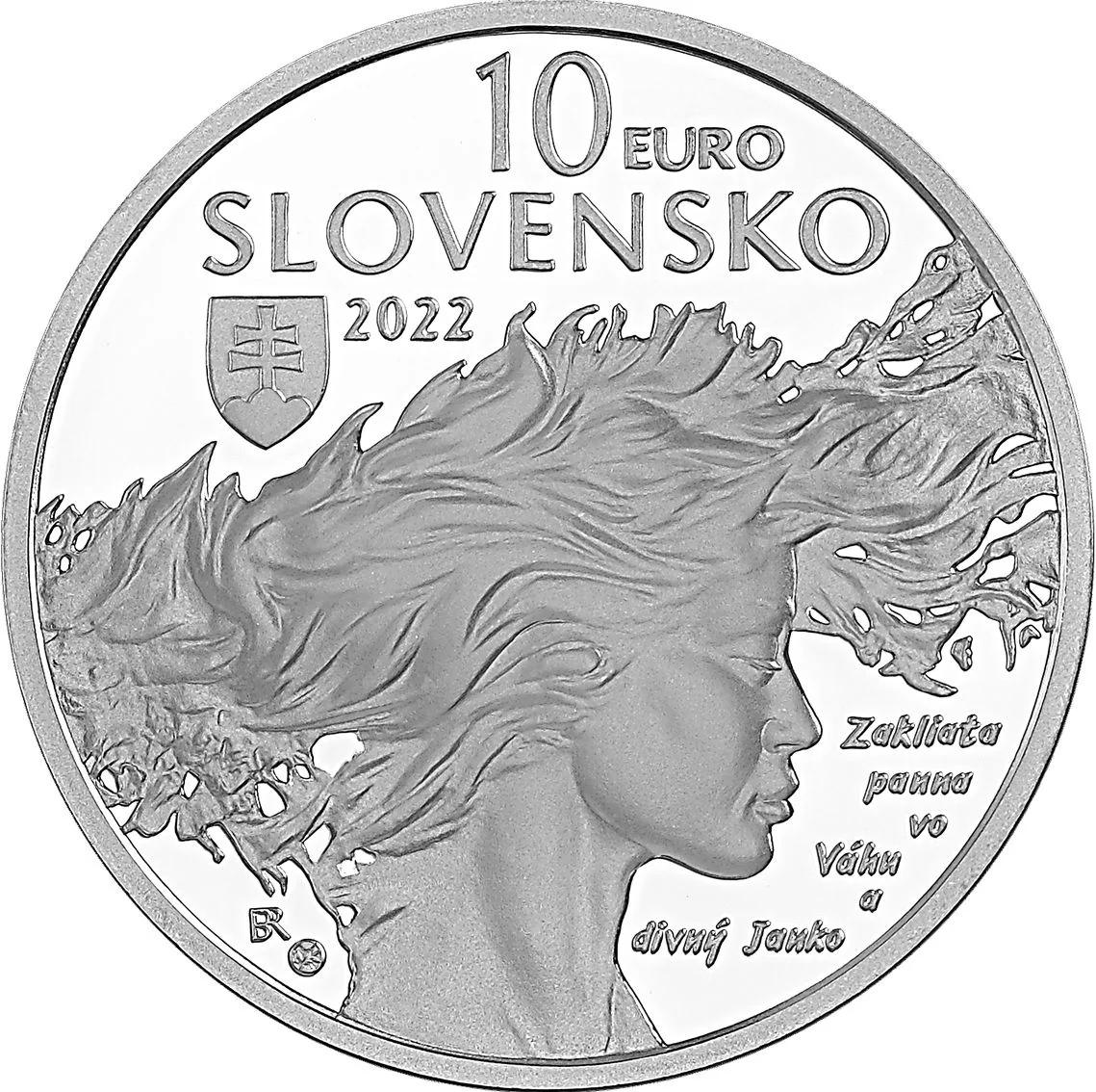 The obverse features the maiden from Janko Kráľ's ballad "The Cursed Maiden in the Váh and Crazy Janko," her wild hair symbolizing the Váh River. The ballad's title is inscribed at lower right. At lower left are designer Branislav Ronai's initials "BR" and the Kremnica Mint mark "MK." The Slovak coat of arms and year "2022" are above left, while the denomination "10 EURO" and country name "SLOVENSKO" are at the top.