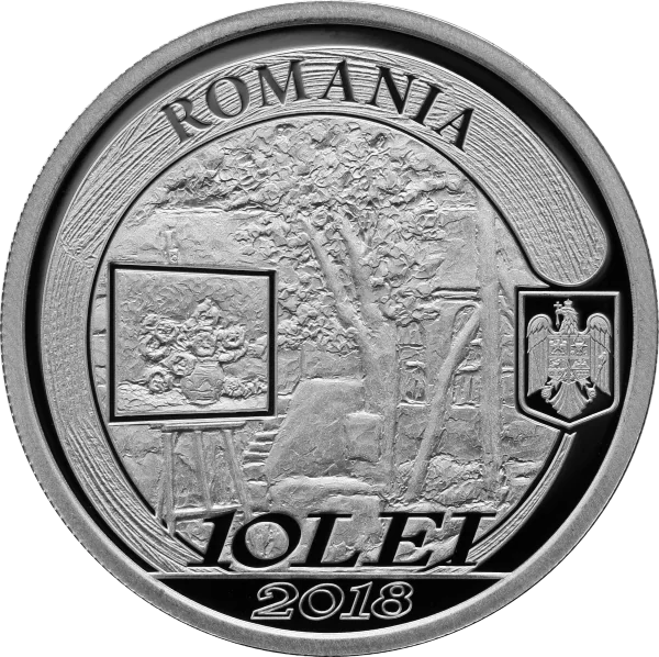 A composition featuring two paintings by Ștefan Luchian: "Anemones" on an easel in the foreground and "Brebu Fountain" in the background, with the arched inscription "ROMANIA", the Romanian coat of arms, face value "10 LEI", and issue year "2018".